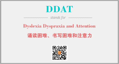上述内容是“Dyslexia Dyspraxia and Attention”作为“DDAT”的缩写,解释为“诵读困难、书写困难和注意力”时的信息,以及英文缩略词DDAT所代表的英文单词,其对应的中文拼音、详细解释以及在英文中的流行度和相关分类、应用领域及应用示例等。