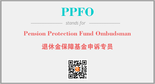 上述内容是“Pension Protection Fund Ombudsman”作为“PPFO”的缩写,解释为“退休金保障基金申诉专员”时的信息,以及英文缩略词PPFO所代表的英文单词,其对应的中文拼音、详细解释以及在英文中的流行度和相关分类、应用领域及应用示例等。