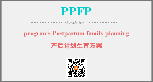 英文缩略词“PPFP”经常作为“programs Postpartum family planning”的英文缩写来使用,中文表示:“产后计划生育方案”。本文将详细介绍英文缩写词PPFP所代表英文单词,其对应的中文拼音、详细解释以及在英语中的流行度。此外,还有关于缩略词PPFP的分类、应用领域及相关应用示例等。