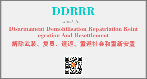 英文缩略词“DDRRR”经常作为“Disarmament Demobilisation Repatriation Reintegration And Resettlement”的英文缩写来使用,中文表示:“解除武装、复员、遣返、重返社会和重新安置”。本文将详细介绍英文缩写词DDRRR所代表英文单词,其对应的中文拼音、详细解释以及在英语中的流行度。此外,还有关于缩略词DDRRR的分类、应用领域及相关应用示例等。