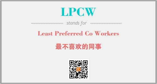 英文缩略词“LPCW”经常作为“Least Preferred Co Workers”的英文缩写来使用,中文表示:“最不喜欢的同事”。本文将详细介绍英文缩写词LPCW所代表英文单词,其对应的中文拼音、详细解释以及在英语中的流行度。此外,还有关于缩略词LPCW的分类、应用领域及相关应用示例等。