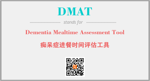 上述内容是“Dementia Mealtime Assessment Tool”作为“DMAT”的缩写,解释为“痴呆症进餐时间评估工具”时的信息,以及英文缩略词DMAT所代表的英文单词,其对应的中文拼音、详细解释以及在英文中的流行度和相关分类、应用领域及应用示例等。