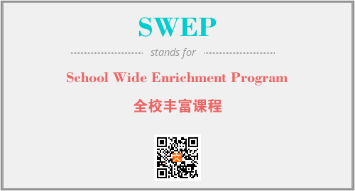 英文缩略词“SWEP”经常作为“School Wide Enrichment Program”的英文缩写来使用,中文表示:“全校丰富课程”。本文将详细介绍英文缩写词SWEP所代表英文单词,其对应的中文拼音、详细解释以及在英语中的流行度。此外,还有关于缩略词SWEP的分类、应用领域及相关应用示例等。