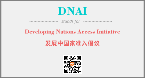 上述内容是“Developing Nations Access Initiative”作为“DNAI”的缩写,解释为“发展中国家准入倡议”时的信息,以及英文缩略词DNAI所代表的英文单词,其对应的中文拼音、详细解释以及在英文中的流行度和相关分类、应用领域及应用示例等。