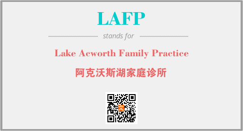 英文缩略词“LAFP”经常作为“Lake Acworth Family Practice”的英文缩写来使用,中文表示:“阿克沃斯湖家庭诊所”。本文将详细介绍英文缩写词LAFP所代表英文单词,其对应的中文拼音、详细解释以及在英语中的流行度。此外,还有关于缩略词LAFP的分类、应用领域及相关应用示例等。
