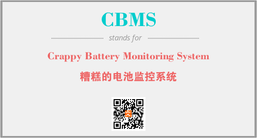 英文缩略词“CBMS”经常作为“Crappy Battery Monitoring System”的英文缩写来使用,中文表示:“糟糕的电池监控系统”。本文将详细介绍英文缩写词CBMS所代表英文单词,其对应的中文拼音、详细解释以及在英语中的流行度。此外,还有关于缩略词CBMS的分类、应用领域及相关应用示例等。