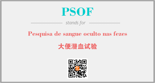 上述内容是“Pesquisa de sangue oculto nas fezes”作为“PSOF”的缩写,解释为“大便潜血试验”时的信息,以及英文缩略词PSOF所代表的英文单词,其对应的中文拼音、详细解释以及在英文中的流行度和相关分类、应用领域及应用示例等。