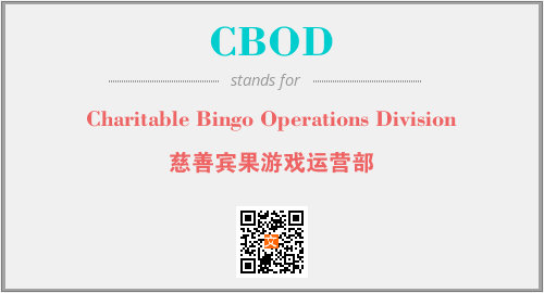 英文缩略词“CBOD”经常作为“Charitable Bingo Operations Division”的英文缩写来使用,中文表示:“慈善宾果游戏运营部”。本文将详细介绍英文缩写词CBOD所代表英文单词,其对应的中文拼音、详细解释以及在英语中的流行度。此外,还有关于缩略词CBOD的分类、应用领域及相关应用示例等。