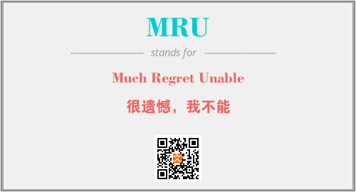 上述内容是“Much Regret Unable”作为“MRU”的缩写,解释为“很遗憾,我不能”时的信息,以及英文缩略词MRU所代表的英文单词,其对应的中文拼音、详细解释以及在英文中的流行度和相关分类、应用领域及应用示例等。