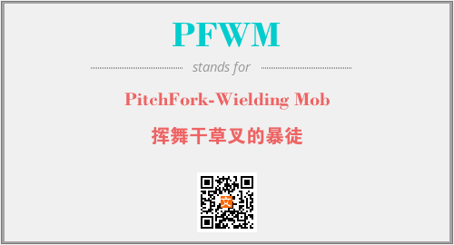 英文缩略词“PFWM”经常作为“PitchFork-Wielding Mob”的英文缩写来使用,中文表示:“挥舞干草叉的暴徒”。本文将详细介绍英文缩写词PFWM所代表英文单词,其对应的中文拼音、详细解释以及在英语中的流行度。此外,还有关于缩略词PFWM的分类、应用领域及相关应用示例等。