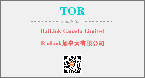 上述内容是“RaiLink Canada Limited”作为“TOR”的缩写,解释为“RaiLink加拿大有限公司”时的信息,以及英文缩略词TOR所代表的英文单词,其对应的中文拼音、详细解释以及在英文中的流行度和相关分类、应用领域及应用示例等。