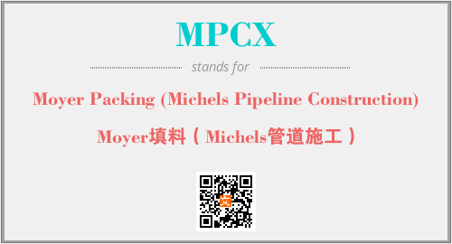 上述内容是“Moyer Packing (Michels Pipeline Construction)”作为“MPCX”的缩写,解释为“Moyer填料(Michels管道施工)”时的信息,以及英文缩略词MPCX所代表的英文单词,其对应的中文拼音、详细解释以及在英文中的流行度和相关分类、应用领域及应用示例等。