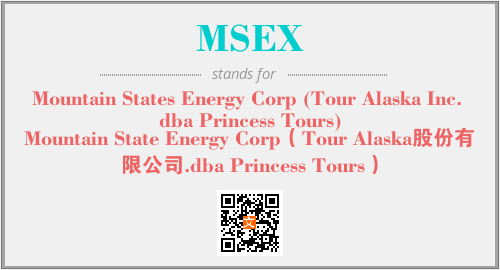 上述内容是“Mountain States Energy Corp (Tour Alaska Inc. dba Princess Tours)”作为“MSEX”的缩写,解释为“Mountain State Energy Corp(Tour Alaska股份有限公司.dba Princess Tours)”时的信息,以及英文缩略词MSEX所代表的英文单词,其对应的中文拼音、详细解释以及在英文中的流行度和相关分类、应用领域及应用示例等。