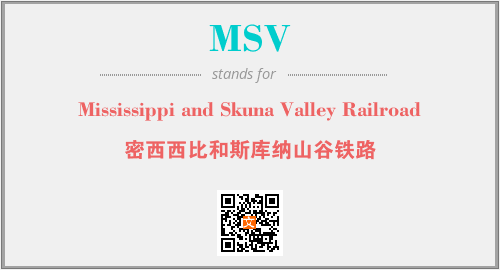 上述内容是“Mississippi and Skuna Valley Railroad”作为“MSV”的缩写,解释为“密西西比和斯库纳山谷铁路”时的信息,以及英文缩略词MSV所代表的英文单词,其对应的中文拼音、详细解释以及在英文中的流行度和相关分类、应用领域及应用示例等。