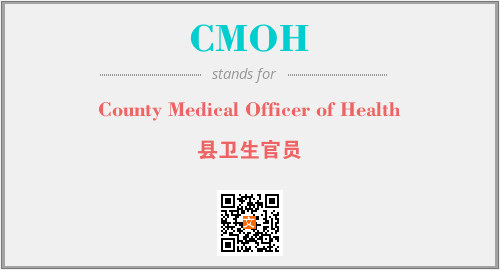 英文缩略词“CMOH”经常作为“County Medical Officer of Health”的英文缩写来使用,中文表示:“县卫生官员”。本文将详细介绍英文缩写词CMOH所代表英文单词,其对应的中文拼音、详细解释以及在英语中的流行度。此外,还有关于缩略词CMOH的分类、应用领域及相关应用示例等。
