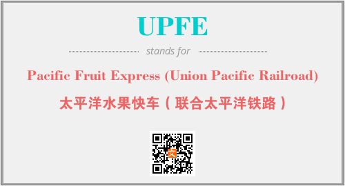 上述内容是“Pacific Fruit Express (Union Pacific Railroad)”作为“UPFE”的缩写,解释为“太平洋水果快车(联合太平洋铁路)”时的信息,以及英文缩略词UPFE所代表的英文单词,其对应的中文拼音、详细解释以及在英文中的流行度和相关分类、应用领域及应用示例等。