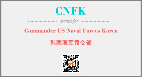上述内容是“Commander US Naval Forces Korea”作为“CNFK”的缩写,解释为“韩国海军司令部”时的信息,以及英文缩略词CNFK所代表的英文单词,其对应的中文拼音、详细解释以及在英文中的流行度和相关分类、应用领域及应用示例等。