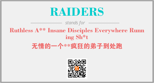 英文缩略词“RAIDERS”经常作为“Ruthless A** Insane Disciples Everywhere Running Sh*t”的英文缩写来使用,中文表示:“无情的一个**疯狂的弟子到处跑”。本文将详细介绍英文缩写词RAIDERS所代表英文单词,其对应的中文拼音、详细解释以及在英语中的流行度。此外,还有关于缩略词RAIDERS的分类、应用领域及相关应用示例等。