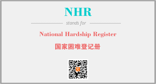 英文缩略词“NHR”经常作为“National Hardship Register”的英文缩写来使用,中文表示:“国家困难登记册”。本文将详细介绍英文缩写词NHR所代表英文单词,其对应的中文拼音、详细解释以及在英语中的流行度。此外,还有关于缩略词NHR的分类、应用领域及相关应用示例等。