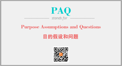 以上为Purpose Assumptions and Questions英文缩略词PAQ的中文解释,以及该英文缩写在英语的流行度、分类和应用领域方面的信息。