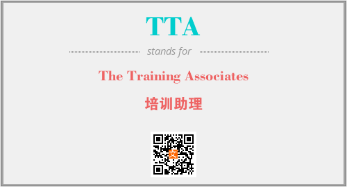 英文缩略词“TTA”经常作为“The Training Associates”的英文缩写来使用,中文表示:“培训助理”。本文将详细介绍英文缩写词TTA所代表英文单词,其对应的中文拼音、详细解释以及在英语中的流行度。此外,还有关于缩略词TTA的分类、应用领域及相关应用示例等。