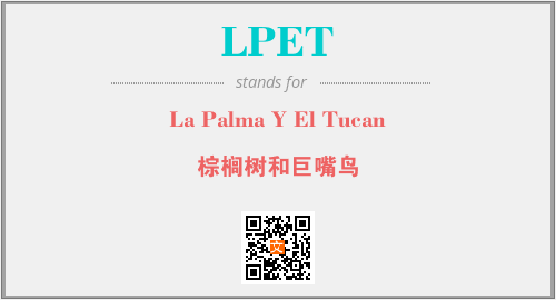 上述内容是“La Palma Y El Tucan”作为“LPET”的缩写,解释为“棕榈树和巨嘴鸟”时的信息,以及英文缩略词LPET所代表的英文单词,其对应的中文拼音、详细解释以及在英文中的流行度和相关分类、应用领域及应用示例等。