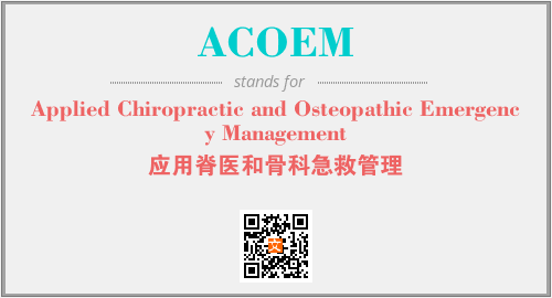 英文缩略词“ACOEM”经常作为“Applied Chiropractic and Osteopathic Emergency Management”的英文缩写来使用,中文表示:“应用脊医和骨科急救管理”。本文将详细介绍英文缩写词ACOEM所代表英文单词,其对应的中文拼音、详细解释以及在英语中的流行度。此外,还有关于缩略词ACOEM的分类、应用领域及相关应用示例等。