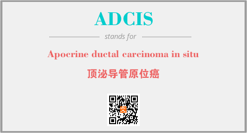 上述内容是“Apocrine ductal carcinoma in situ”作为“ADCIS”的缩写,解释为“顶泌导管原位癌”时的信息,以及英文缩略词ADCIS所代表的英文单词,其对应的中文拼音、详细解释以及在英文中的流行度和相关分类、应用领域及应用示例等。