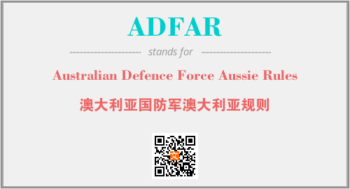 英文缩略词“ADFAR”经常作为“Australian Defence Force Aussie Rules”的英文缩写来使用,中文表示:“澳大利亚国防军澳大利亚规则”。本文将详细介绍英文缩写词ADFAR所代表英文单词,其对应的中文拼音、详细解释以及在英语中的流行度。此外,还有关于缩略词ADFAR的分类、应用领域及相关应用示例等。