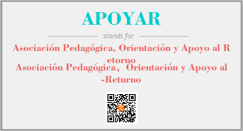上述内容是“Asociación Pedagógica, Orientación y Apoyo al Retorno”作为“APOYAR”的缩写,解释为“Asociación Pedagógica,Orientación y Apoyo al-Returno”时的信息,以及英文缩略词APOYAR所代表的英文单词,其对应的中文拼音、详细解释以及在英文中的流行度和相关分类、应用领域及应用示例等。