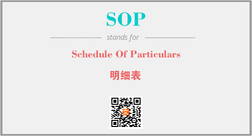 上述内容是“Schedule Of Particulars”作为“SOP”的缩写,解释为“明细表”时的信息,以及英文缩略词SOP所代表的英文单词,其对应的中文拼音、详细解释以及在英文中的流行度和相关分类、应用领域及应用示例等。