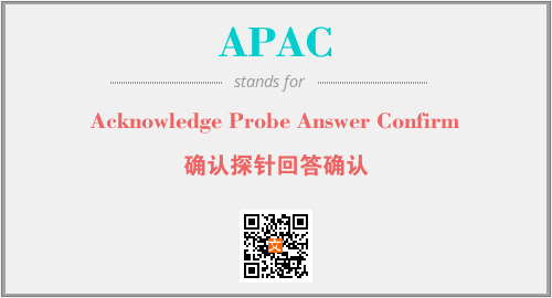 上述内容是“Acknowledge Probe Answer Confirm”作为“APAC”的缩写,解释为“确认探针回答确认”时的信息,以及英文缩略词APAC所代表的英文单词,其对应的中文拼音、详细解释以及在英文中的流行度和相关分类、应用领域及应用示例等。