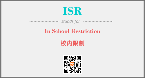 英文缩略词“ISR”经常作为“In School Restriction”的英文缩写来使用,中文表示:“校内限制”。本文将详细介绍英文缩写词ISR所代表英文单词,其对应的中文拼音、详细解释以及在英语中的流行度。此外,还有关于缩略词ISR的分类、应用领域及相关应用示例等。