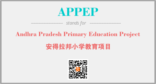 上述内容是“Andhra Pradesh Primary Education Project”作为“APPEP”的缩写,解释为“安得拉邦小学教育项目”时的信息,以及英文缩略词APPEP所代表的英文单词,其对应的中文拼音、详细解释以及在英文中的流行度和相关分类、应用领域及应用示例等。