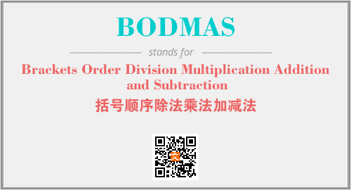 英文缩略词“BODMAS”经常作为“Brackets Order Division Multiplication Addition and Subtraction”的英文缩写来使用,中文表示:“括号顺序除法乘法加减法”。本文将详细介绍英文缩写词BODMAS所代表英文单词,其对应的中文拼音、详细解释以及在英语中的流行度。此外,还有关于缩略词BODMAS的分类、应用领域及相关应用示例等。