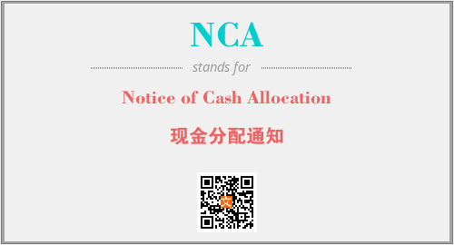 上述内容是“Notice of Cash Allocation”作为“NCA”的缩写,解释为“现金分配通知”时的信息,以及英文缩略词NCA所代表的英文单词,其对应的中文拼音、详细解释以及在英文中的流行度和相关分类、应用领域及应用示例等。