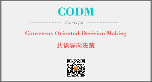 上述内容是“Consensus Oriented Decision Making”作为“CODM”的缩写,解释为“共识导向决策”时的信息,以及英文缩略词CODM所代表的英文单词,其对应的中文拼音、详细解释以及在英文中的流行度和相关分类、应用领域及应用示例等。