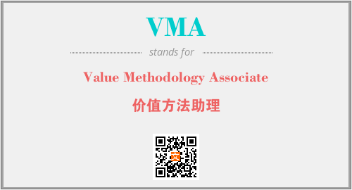 英文缩略词“VMA”经常作为“Value Methodology Associate”的英文缩写来使用,中文表示:“价值方法助理”。本文将详细介绍英文缩写词VMA所代表英文单词,其对应的中文拼音、详细解释以及在英语中的流行度。此外,还有关于缩略词VMA的分类、应用领域及相关应用示例等。