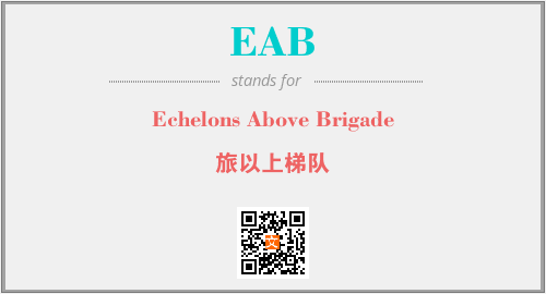 上述内容是“Echelons Above Brigade”作为“EAB”的缩写,解释为“旅以上梯队”时的信息,以及英文缩略词EAB所代表的英文单词,其对应的中文拼音、详细解释以及在英文中的流行度和相关分类、应用领域及应用示例等。
