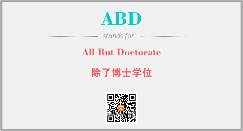 上述内容是“All But Doctorate”作为“ABD”的缩写,解释为“除了博士学位”时的信息,以及英文缩略词ABD所代表的英文单词,其对应的中文拼音、详细解释以及在英文中的流行度和相关分类、应用领域及应用示例等。