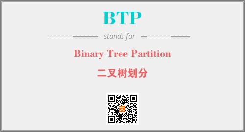 上述内容是“Binary Tree Partition”作为“BTP”的缩写,解释为“二叉树划分”时的信息,以及英文缩略词BTP所代表的英文单词,其对应的中文拼音、详细解释以及在英文中的流行度和相关分类、应用领域及应用示例等。
