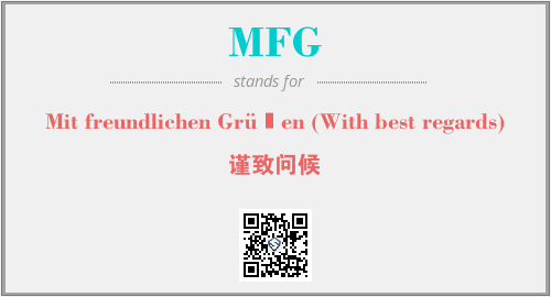 上述内容是“Mit freundlichen Grüßen (With best regards)”作为“MFG”的缩写,解释为“谨致问候”时的信息,以及英文缩略词MFG所代表的英文单词,其对应的中文拼音、详细解释以及在英文中的流行度和相关分类、应用领域及应用示例等。