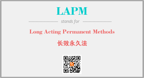英文缩略词“LAPM”经常作为“Long Acting Permanent Methods”的英文缩写来使用,中文表示:“长效永久法”。本文将详细介绍英文缩写词LAPM所代表英文单词,其对应的中文拼音、详细解释以及在英语中的流行度。此外,还有关于缩略词LAPM的分类、应用领域及相关应用示例等。