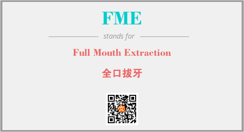 上述内容是“Full Mouth Extraction”作为“FME”的缩写,解释为“全口拔牙”时的信息,以及英文缩略词FME所代表的英文单词,其对应的中文拼音、详细解释以及在英文中的流行度和相关分类、应用领域及应用示例等。