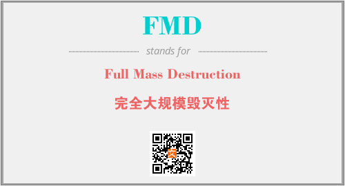 英文缩略词“FMD”经常作为“Full Mass Destruction”的英文缩写来使用,中文表示:“完全大规模毁灭性”。本文将详细介绍英文缩写词FMD所代表英文单词,其对应的中文拼音、详细解释以及在英语中的流行度。此外,还有关于缩略词FMD的分类、应用领域及相关应用示例等。