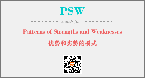 上述内容是“Patterns of Strengths and Weaknesses”作为“PSW”的缩写,解释为“优势和劣势的模式”时的信息,以及英文缩略词PSW所代表的英文单词,其对应的中文拼音、详细解释以及在英文中的流行度和相关分类、应用领域及应用示例等。