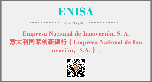 英文缩略词“ENISA”经常作为“Empresa Nacional de Innovación, S. A.”的英文缩写来使用,中文表示:“意大利国家创新银行(Empresa National de Innovación,S.A.)。”。本文将详细介绍英文缩写词ENISA所代表英文单词,其对应的中文拼音、详细解释以及在英语中的流行度。此外,还有关于缩略词ENISA的分类、应用领域及相关应用示例等。