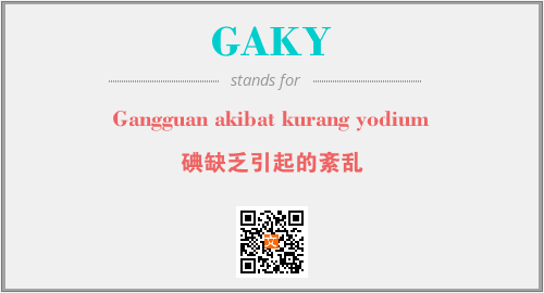 上述内容是“Gangguan akibat kurang yodium”作为“GAKY”的缩写,解释为“碘缺乏引起的紊乱”时的信息,以及英文缩略词GAKY所代表的英文单词,其对应的中文拼音、详细解释以及在英文中的流行度和相关分类、应用领域及应用示例等。
