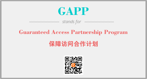 以上为Guaranteed Access Partnership Program英文缩略词GAPP的中文解释,以及该英文缩写在英语的流行度、分类和应用领域方面的信息。
