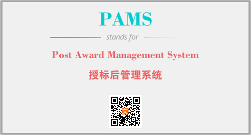 上述内容是“Post Award Management System”作为“PAMS”的缩写,解释为“授标后管理系统”时的信息,以及英文缩略词PAMS所代表的英文单词,其对应的中文拼音、详细解释以及在英文中的流行度和相关分类、应用领域及应用示例等。